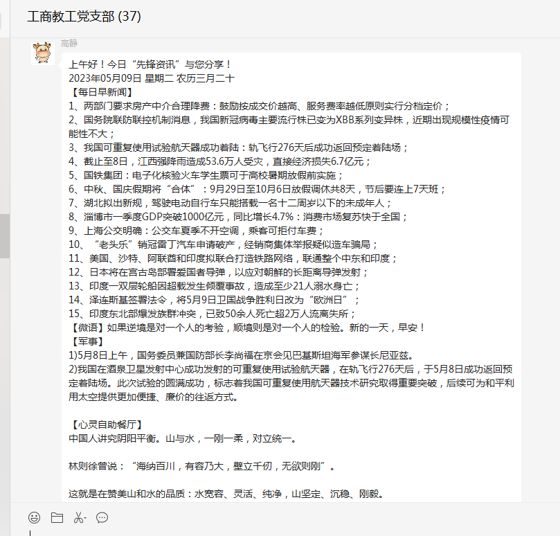 为了学习贯彻习近平新时代中国特色社会主义思想主题教育,坚持学思用贯通、知信行统一,推动主题教育扎实开展,开云kaiyun官网教工党支部从5月8日起推出“先锋资讯”栏目活动。