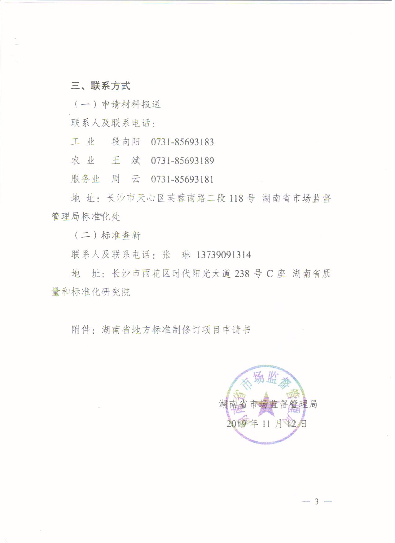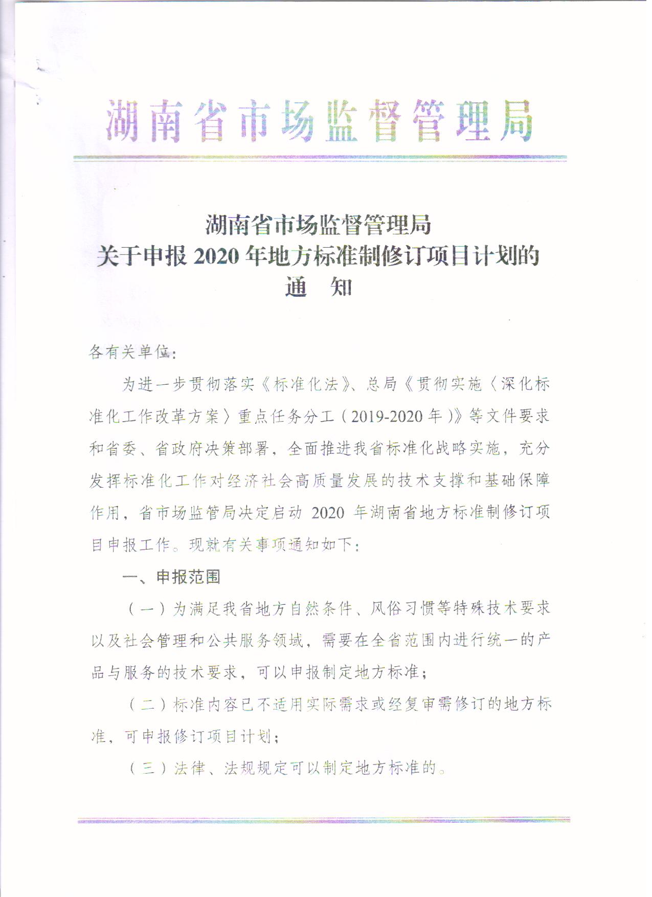 转发:湖南省市场监督管理局《关于申报2020年地方标准制修订项目计划的通知》