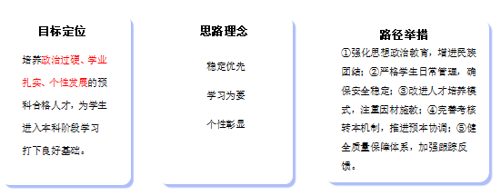 一是高站位思路谋划。遵循“教师教好、学生学好、学校管好”三位一体总要求,强化“学生中心、产出导向、持续改进”理念,通过实地调研、兄弟院校交流、往届预科学生跟踪调查等方式,拟定人才培养方案,明确人才培养目标定位为:培养政治过硬、学业扎实、个性发展的预科合格人才,为学生进入本科阶段学习打下扎实基础;思路理念:稳定优先、学习为要、个性彰显;路径举措有:一是强化思想政治引领,增进民族团结;二是严格学生日常管理,确保安全稳定;三是改进人才培养模式,强调因材施教;四是完善考核转本机制,推进预本协调;五是健全质量保障体系,加强跟踪反馈