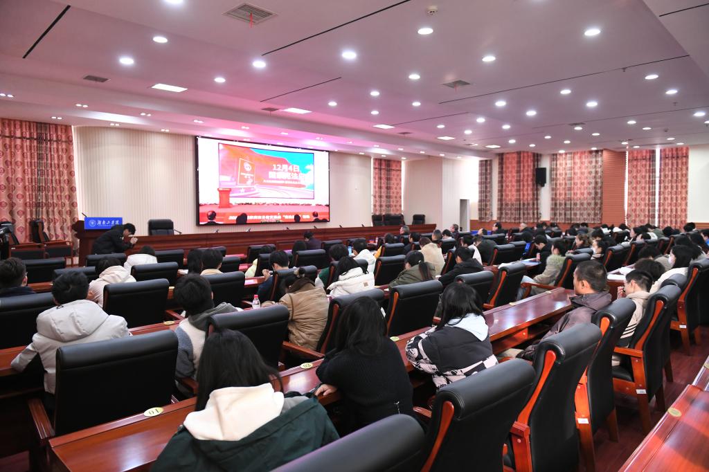 12月4日上午,学校党委委员、副校长、宣传部、统战部部长刘龙昌,宣传部、学生工作部、校团委负责人,各二级学院党委副书记、全体辅导员及学生代表在船山报告厅集中收看2023年国家宪法日教育系统“宪法晨读”活动。