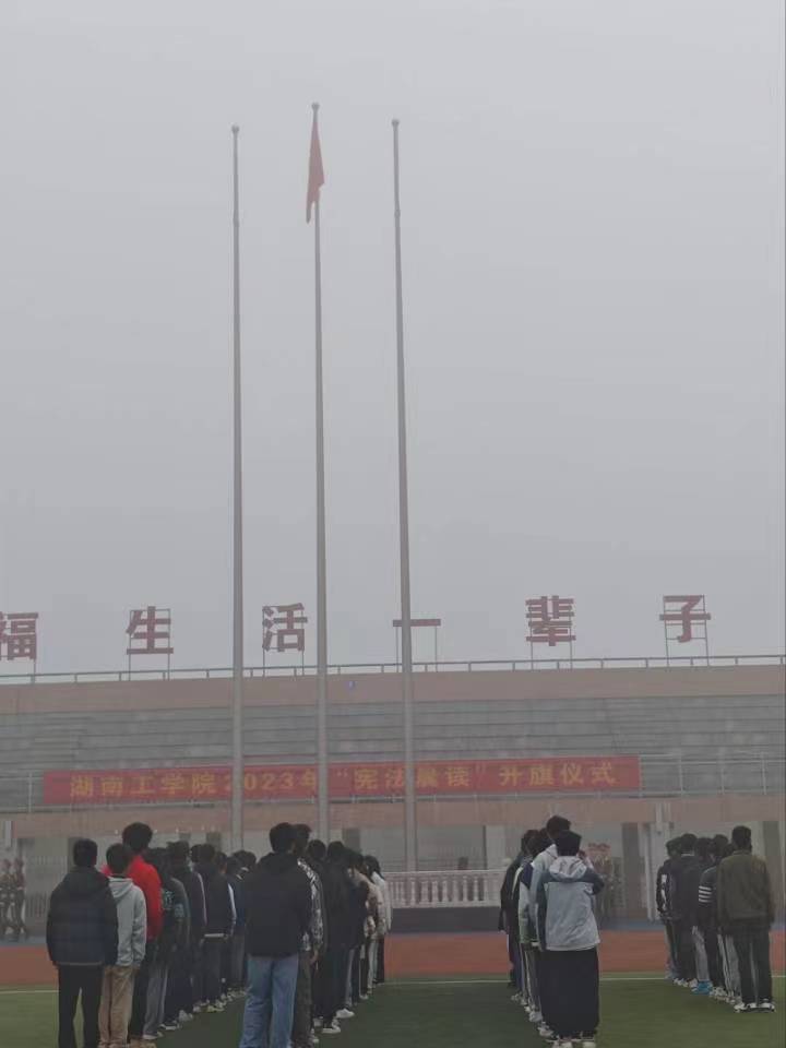 12月5日清晨,随着一声嘹亮的“出旗”,英姿飒爽的国旗护卫队护送国旗进场,雄壮庄严的国歌在清晨的校园回荡。升旗完毕后,理学院学生会主席奉世民带领同学们集体齐声朗读宪法部分条例,充分了解我国宪法的基本内容。
