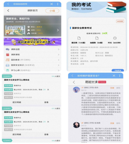 开元官网依托易班平台主阵地,开设线上“国家安全,易起行动”易班优课,围绕国家安全“专题教育”、“重点宣传”、“资源拓展”、“理论学习”、“知识竞答”、“课群话题讨论”六大模块开展宣传教育活动,优课精选相关课程23节,截至目前,参与人数达2402人,课群活跃度达到8482个,发布讨论话题932个,学习资料阅读量1581人次,设置国家安全知识闯关题135道,累计已有1400人完成考试。
