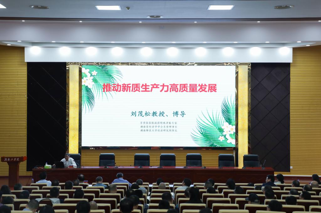 4月23日下午,学校在明翰报告厅组织召开党委理论学习中心组(扩大)第四次集中学习研讨,邀请了湖南师范大学经济学研究所所长刘茂松教授作专题报告,深入学习贯彻习近平总书记关于新质生产力的重要论述,奋力推动高质量发展。校党委书记曹执令主持会议。