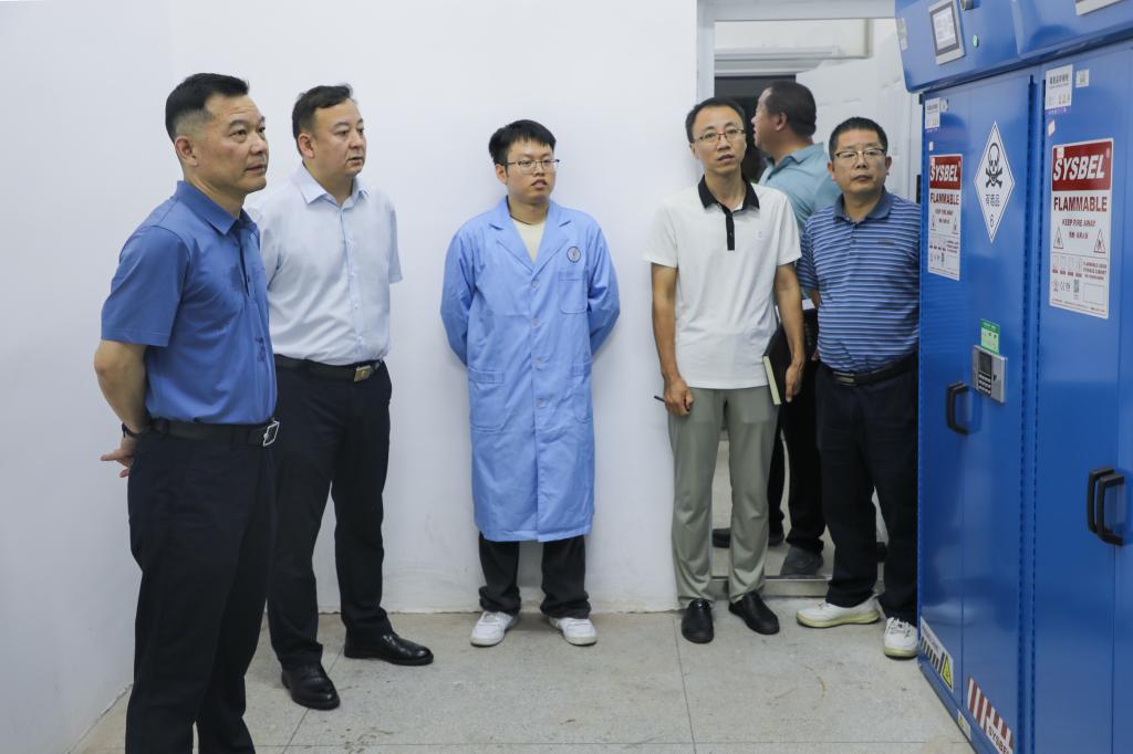 在材化楼,检查组一行检查了危化品储存、使用和废弃处置等重点部位及有关实验室。要求对实验室安全管理责任到人,牢固树立安全红线意识,做好实验室仪器设备的检查与维护,为学校的教学和科研实验筑牢安全防线。