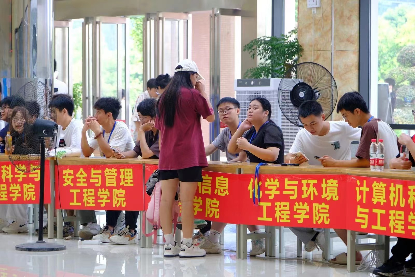为迎接新生,各学院纷纷推出了别具匠心的迎新活动。安全与管理工程学院为新生精心准备了安“新”刮刮乐和校徽等小礼物,并设立了贴满新生寄语的祝福墙,吸引了新生和家长们合影留念,记录下温馨时刻。电气与信息工程学院与材料科学与工程学院分别设立了新生签名墙,大家在签名墙前留下了大学生活的第一份记忆。化学与环境工程学院则准备了清凉的小雪糕和酸梅汤,为在炎热天气中的新生和家长送去一丝凉意。外国语学院大厅内,中文、英语、日语精心设计的专业指示牌充满学院特色,体现了浓厚的文化氛围。计算机科学与工程学院为新生定制了印有院徽的马克杯,并邀请新生写下对四年后自己的一封信,激励他们坚守初心,勇敢追梦。设计与艺术学院则利用学生作品布置了独具创意的打卡点,引导新生勇于创新、实践。