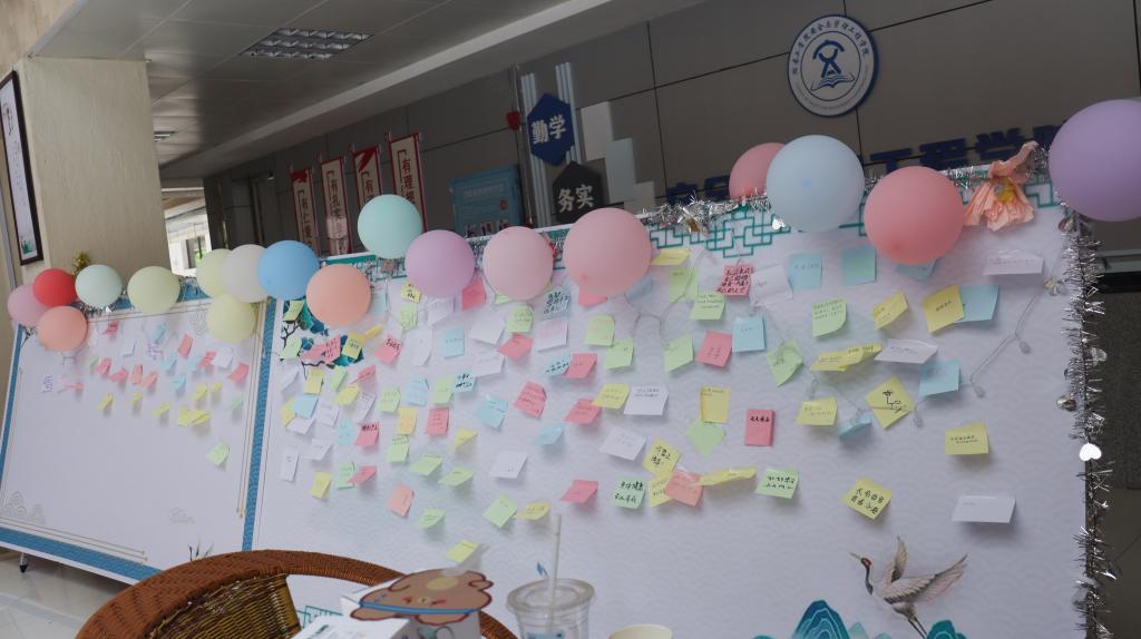 安全与管理工程学院设立的贴满新生寄语的祝福墙