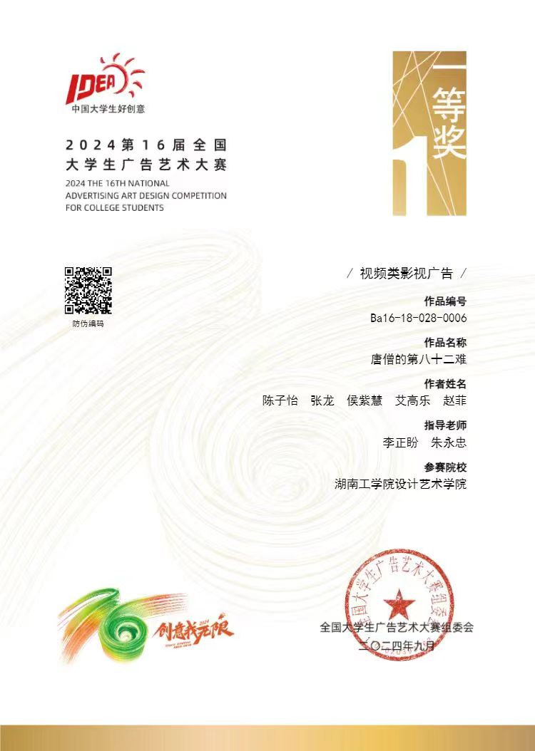 近日,第十六届全国大学生广告艺术大赛(以下简称:大广赛)国赛评审落下帷幕,开元官网设计艺术学院陈子怡、张龙、侯紫慧等同学提交的“唐僧的第八十二难”作品经过层层选拔,最终荣获一等奖,这是开元官网自参加大广赛以来的最佳成绩。