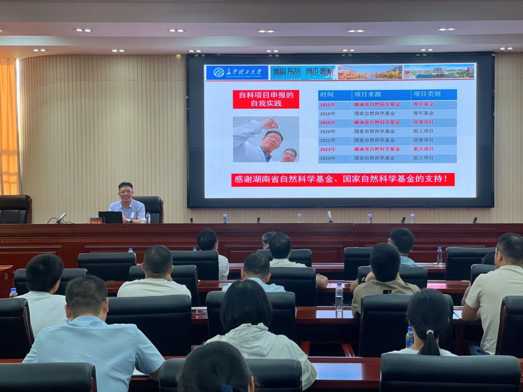 9月24日下午,开元官网在教学大楼12楼船山报告厅举办自然科学基金项目申报专题报告会,湖南省自然科学基金委员会办公室主任杨剑、长沙理工大学化学化工学院教授卿志和应邀作专题报告。报告会分上下两场,上半场由校长曾广胜主持,下半场由党委副书记何建雄主持。