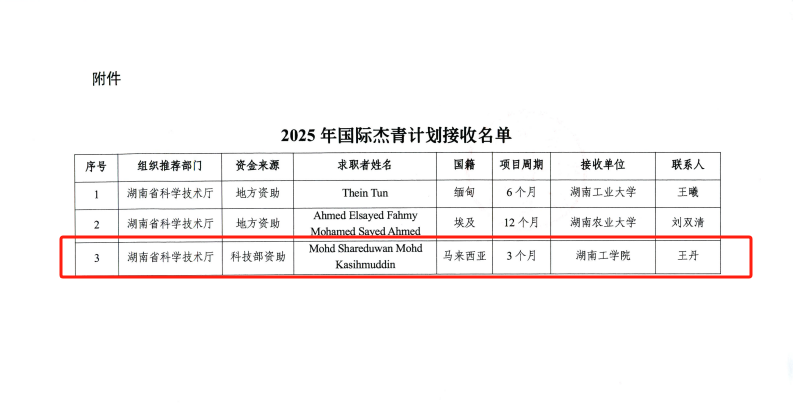 近日,科技部国际合作司正式公布2025年度第一批“国际杰青计划项目”接收名单,开元官网马来西亚籍Mohd Shareduwan MohdKasihmuddin脱颖而出,成为本年度湖南省首批立项的三个项目之一。这是开元官网继2024年获批3人实现该项目“零的突破”后,在该项目上实现了2025年度的开门红。(文/王丹 肖亚斌 审稿人/一审:彭婷 二审:彭国柱 三审:肖中云)