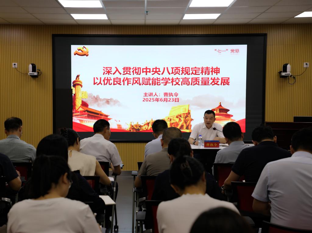 6月23日,校党委书记曹执令以《深入贯彻中央八项规定精神 以优良作风赋能学校高质量发展》为题,为分管部门、联系单位党员干部讲授专题党课。