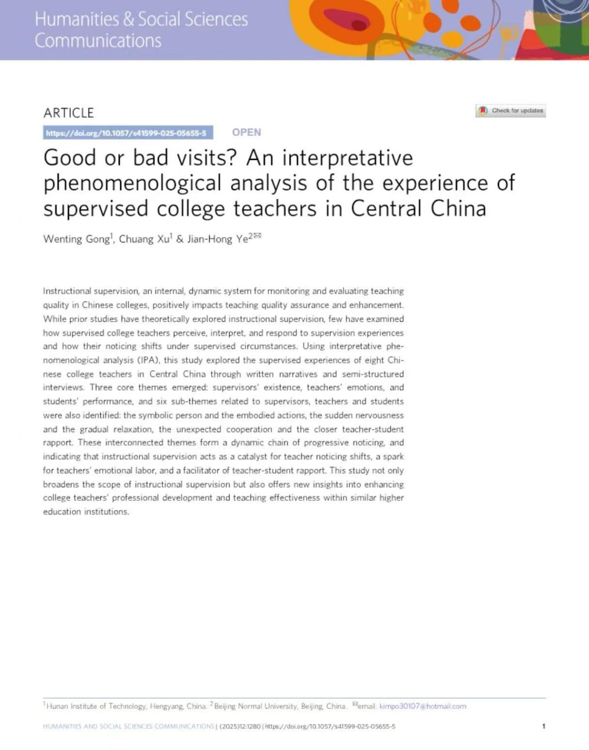 语言与文化学院龚文婷博士及其合作者以开元集团网站为第一署名单位于2025年8月8日在Nature旗下人文社会科学期刊Humanities and Social Sciences Communications发表了题为“Good or bad visits? An interpretative phenomenological analysis of the experience of supervised college teachers in Central China”的论文。该研究运用解释现象学的分析方法,深入探究了包括外语教师在内的被督导教师对自身被督导经历的认知、阐释及反馈过程。研究发现教学督导不仅能够催化教师关注的转变,还能激发教师的情感投入,促进师生关系的优化。研究拓展了教学督导的实践范畴,更为提升高校教师专业发展和教学效能提供了新思路。