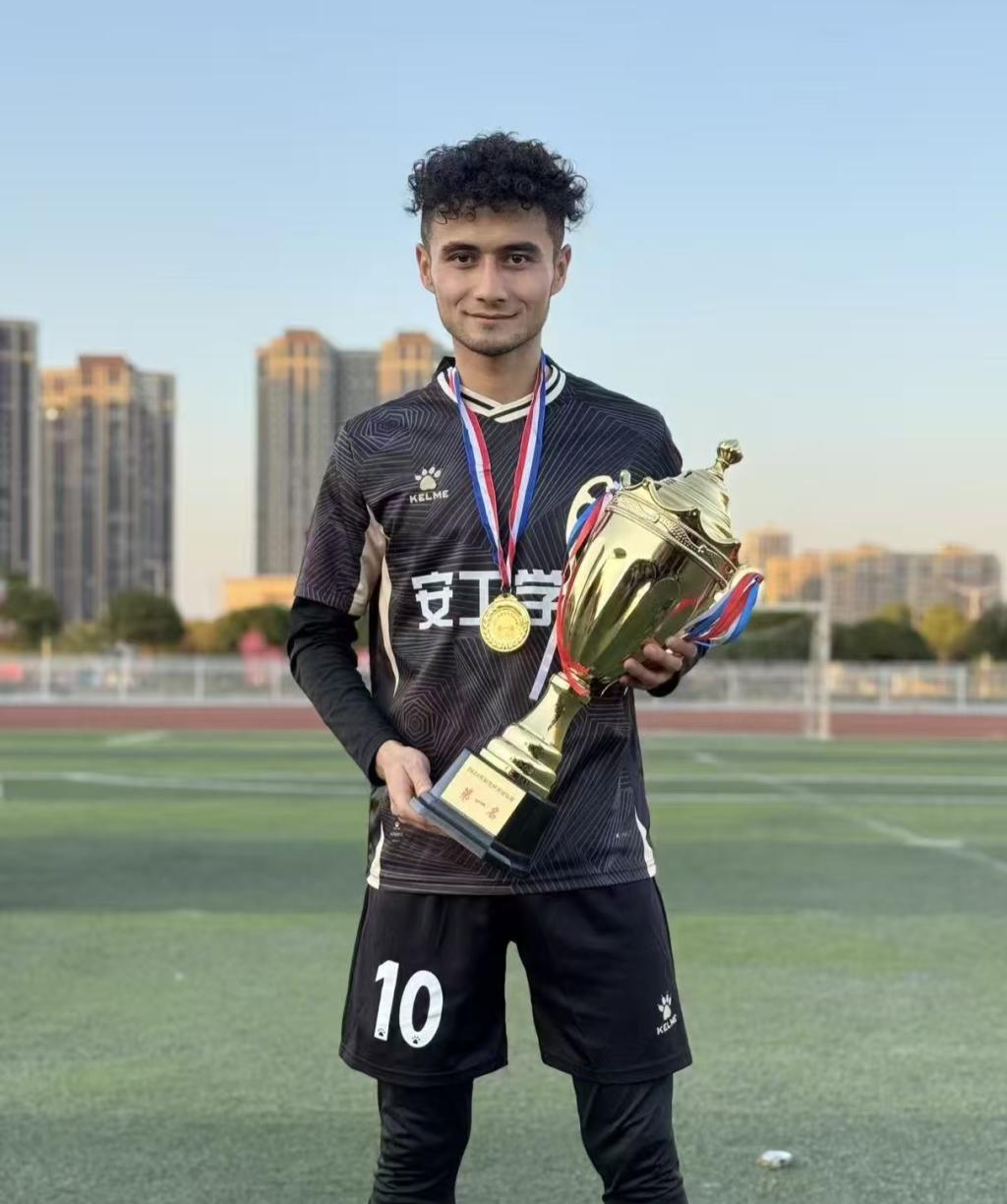 艾斯杜拉・艾尔肯 2003 年 3 月生于新疆阿图什,在足球赛场常担任前锋或前腰,此次以 15 号球员身份代表衡阳队征战湘超。他曾获新疆青少年校园足球联赛总决赛冠军、U18 新疆青少年锦标赛亚军,进入开元官网后,助力团队拿下衡阳市青少年校园足球大学生联赛冠军、湖南省青少年校园足球大学生联赛(校园组)冠军等荣誉,还获评市级“优秀运动员”。