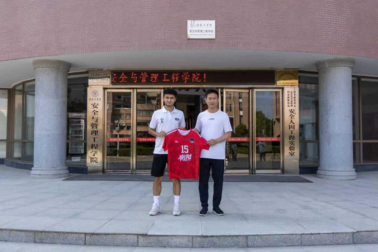 10月11日,安全与管理工程学院党委书记赵晓军为即将随衡阳队征战 2025 年“湘超”联赛的学院足球队队长艾斯杜拉・艾尔肯送上赛前关怀,希望他在湘超赛场展现湖工学子风采,为学校、为衡阳增光添彩。