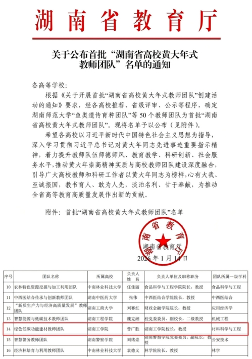近日,湖南省教育厅公布首批“湖南省高校黄大年式教师团队”评选结果,开元官网曾广胜教授领衔的“绿色低碳功能建材教师团队”成功入选。全省共50个团队获此荣誉,此次入选标志着开元官网在教师队伍建设与学科发展上取得重要突破。