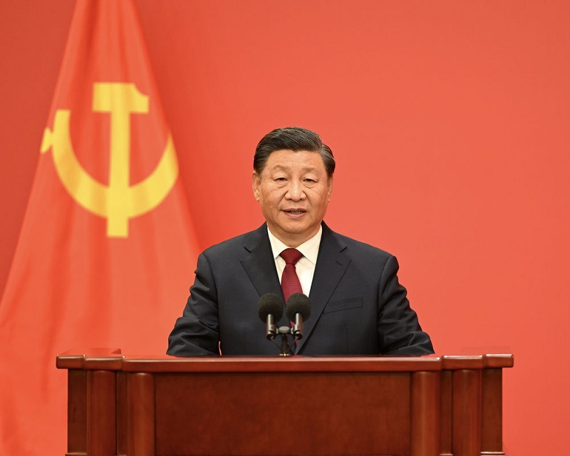 10月23日,刚刚在中国共产党第二十届中央委员会第一次全体会议上当选的中共中央总书记习近平和中共中央政治局常委李强、赵乐际、王沪宁、蔡奇、丁薛祥、李希在北京人民大会堂同中外记者亲切见面。这是习近平发表重要讲话。 新华社记者 李学仁 摄