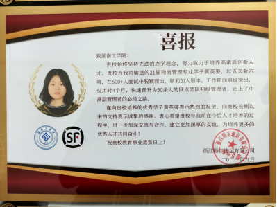 近期我院收到浙江顺丰速运有限公司“喜报”一份。我院为顺丰速运有限公司输送的2021届物流管理专业应届毕业生黄英姿同学,过五关斩六将,在600多人的面试中脱颖而出,顺利加入顺丰集团,并且在工作期间表现优异,仅用时4个月,便快速晋升为30余人的网点团队主管,走上了中高层管理者的晋升之路。