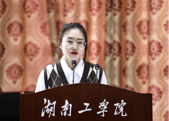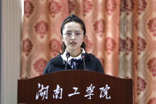 恒企奖学金获奖学生代表工商1801班邓颖发言: 我们要时时牢记“勤学、务实、圆融、卓越”的校训精神,做一个对学校、对社会、对国家有贡献的湖工人。