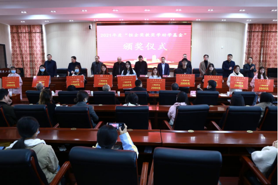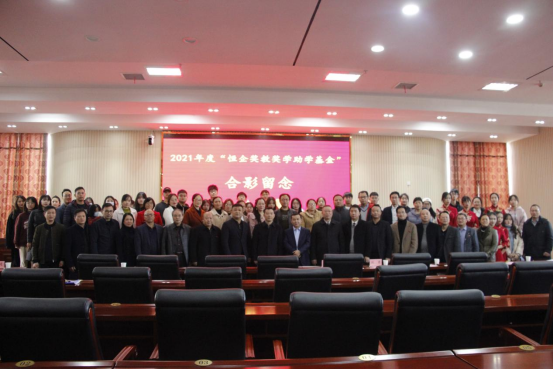 江勇和与会领导一同为优秀教师、获奖及受助学生发放奖教奖学助学金并合影留念。