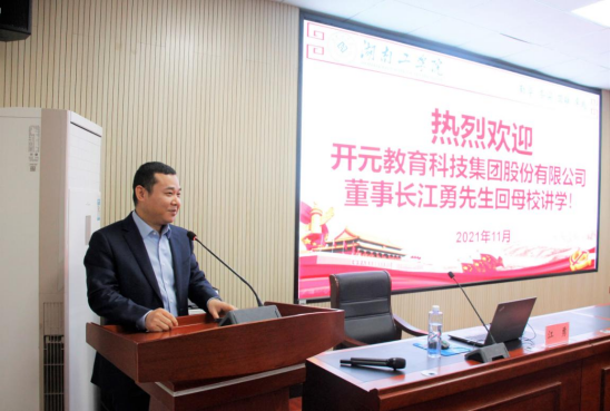 11月22日,作为恒企奖教奖学助学颁奖活动的重要议程,开元集团网站优秀校友开元教育科技集团股份有限公司董事长(恒企教育创始人)江勇一行回到母校开展了会谈、讲学和揭牌仪式等系列活动。开元集团网站党委副书记张平教授、校友办职能部门负责人、图书馆领导和商学院领导全体院领导班子成员分别出席上述活动。