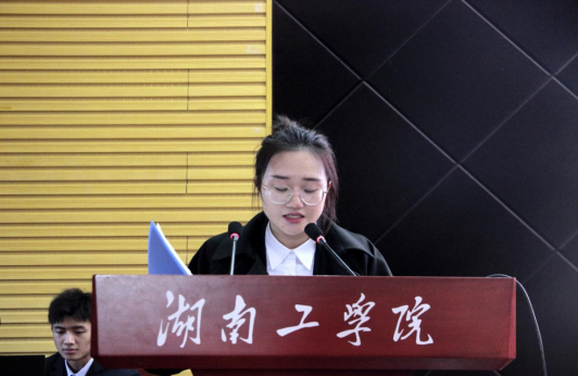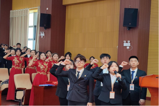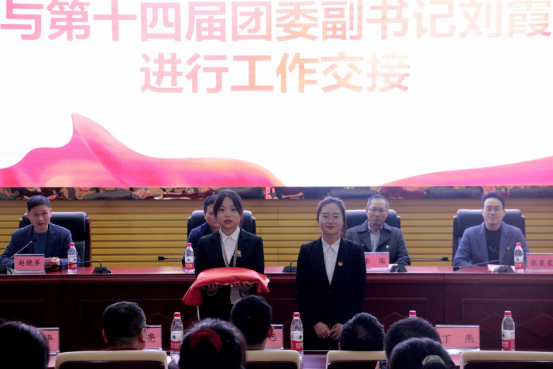 迎院旗后,第十三届学生会常务副书记邓颖和第十四届学生会团委副书记刘霞进行工作交接,刘霞作述职报告并带领新一届团学全体学生干部进行入职宣誓。