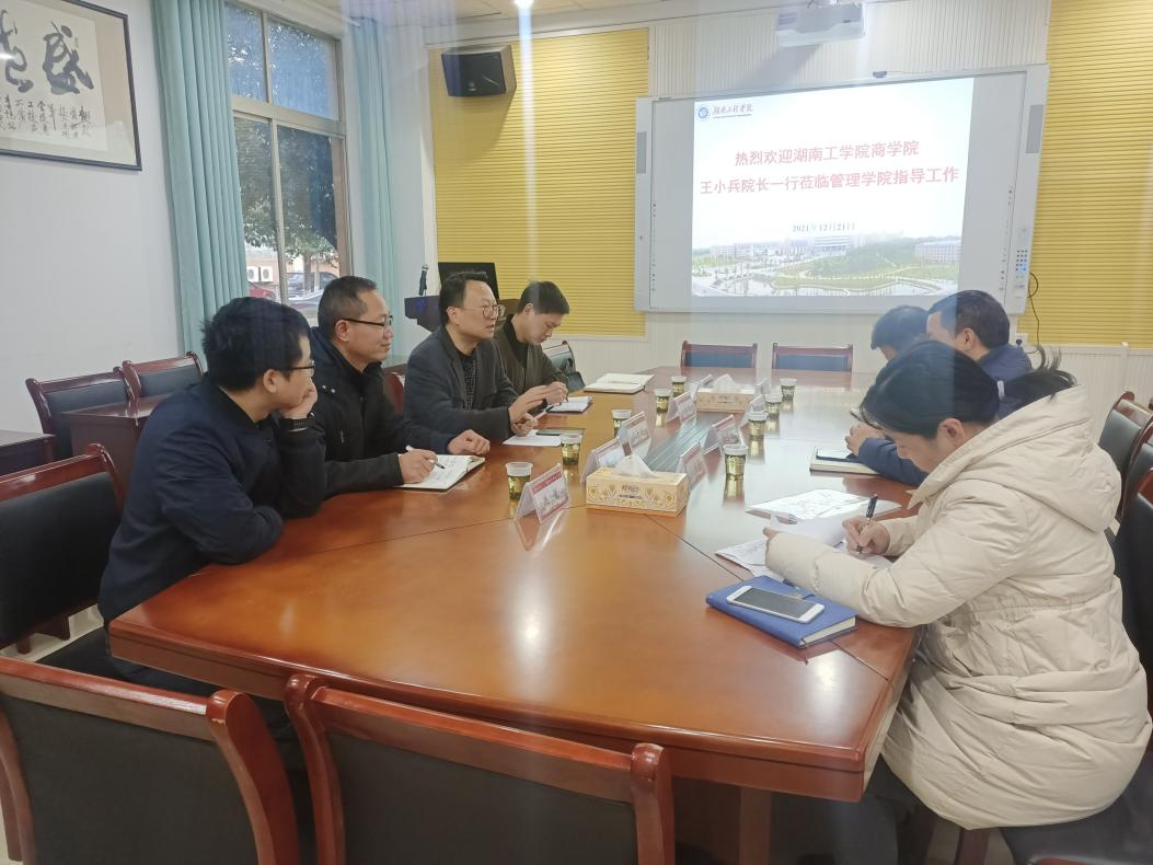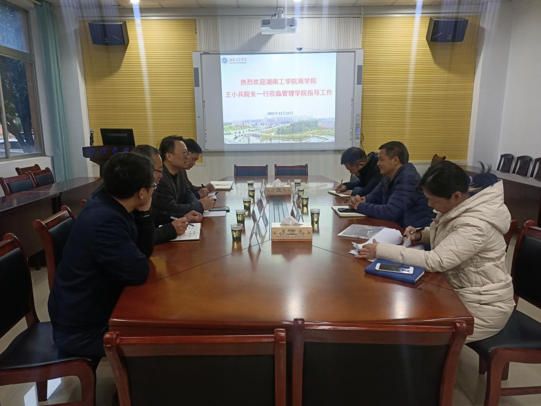 2021年12月21日,商学院院长王小兵、副院长李闯、党委副书记赵晓军、综合办公室主任张星星、会计学教研室博士洪敏一行5人赴湖南工程学院管理学院开展交流访问,调研大数据管理与应用专业的申报与建设、新文科背景下人才培养方案的修订、学生管理等方面的创新做法及先进经验。
