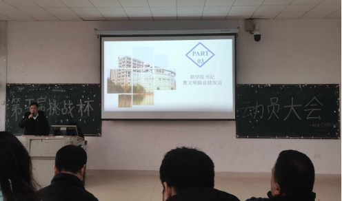 12月30日中午,商学院在经管楼601开展了第五届“挑战杯”大学生创业计划竞赛动员大会。党委书记曹文明、党委副书记赵晓军、副院长黄飞、团委书记李前奔、各教研室主任、实验室主任、学工办全体老师出席会议,学院全体班团与团委学生会各部门部长120余人参加了本次动员大会。会议由协管学院创新创业工作的廖昭文老师主持。