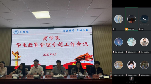 5月5日晚上,学院通过线上线下的方式召开学生教育管理专题工作会议。商学院党委书记曹文明、辅导员、团学干部共计60余人在302会议室参加线下会议,各班班主任、班团、毕业班学生生代表约300余人参加腾讯线上会议,会议由商学院党委副书记赵晓军主持。会议从大学生安全教育、资助诚信教育、心理健康教育、毕业生思想政治教育、就业及审核评估等方面进行了专题辅导和工作部署。