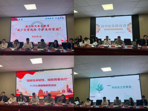 张诗菡作《减少灾害风险,守护美好家园》专题发言,从政治安全、人身安全、网络安全和疫情防控安全四个方面展开,深入推进防灾减灾应急科普知识进学院、进班级、进头脑,营造全员积极参与防灾减灾的良好氛围,提高灾害风险防范意识。马慧娟介绍了学院资助情况,就国家、社会、学校资助政策从申请对象、申请条件、申请流程等进行了详细解读,充分挖掘受助学生的典型事迹,鼓励受助学生积极参加志愿服务和公益活动,同时强调了贷款毕业生诚信还款重要性。朱奕璇开展心理健康教育普及,针对学校各项心理服务活动进行介绍,引导学生善待自我,关爱他人,健康成长,共同创造了良好的校园氛围。段思遥就2022届毕业生思想政治教育、毕业离校和就业等工作进行了具体部署和重点强调,同时针对开元官网本科教育教学审核评估工作进行了二次梳理和任务分解,要求全员坚持深入落实学校审核评估评建要求,健全联动机制,全力以赴迎接审核评估工作。