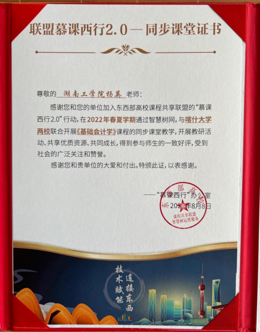 近日,我院朱纪红、温毅娴、杨英、龙桂华四位老师获得“联盟慕课西行2.0-同步课堂证书”。为积极响应“慕课西行2.0”计划,在智慧树网的协助下,我校与喀什大学、新疆科技学院通过东西部高校课程共享联盟平台建立联系,开展了“慕课西行”系列活动。我院教师积极开展“慕课西行”活动,表明教师们不仅以上好课为己任,并努力把好课送到西部去,为西部高等教育贡献力量,彰显了教师们的责任与担当,提升了学院美誉度和影响力。