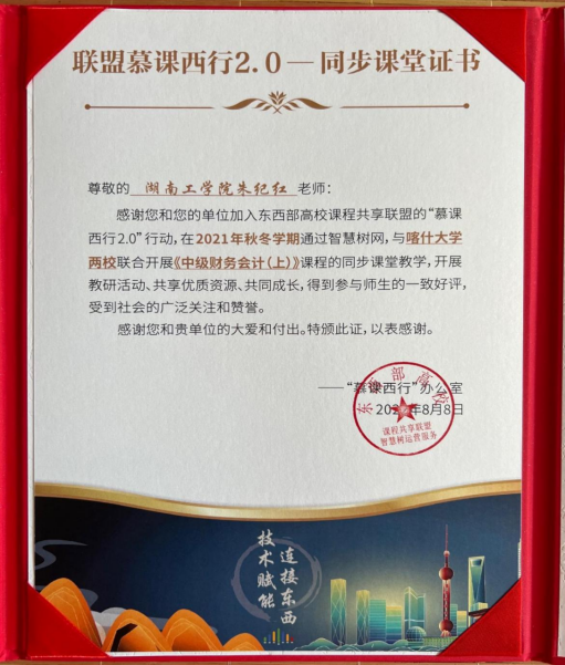 省级一流课程《中级财务会计》负责人朱纪红率先加入“慕课西行”行动,在2021年秋冬学期与喀什大学两校联合开展《中级财务会计(上)》课程的同步课堂教学,得到参与师生的一致好评,并为我院其他教师做了良好的表率。