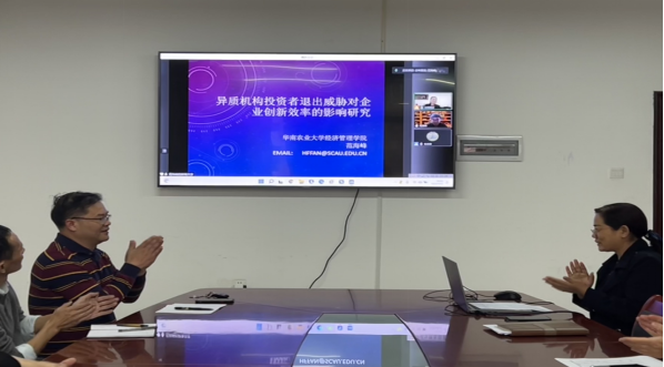 11月3日下午,华南农业大学范海峰博士应邀来我院开展“异质机构投资者退出威胁对公司创新效率的影响研究”线上学术讲座,讲座在经管楼315会议室举行。商学院副院长朱纪红及部分青年教师、学生代表参加此次会议。