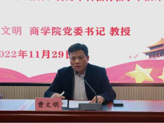 11月29日,商学院召开本科教育教学审核评估动员大会暨二十大精神专题宣讲。商学院党委书记曹文明、全体班主任、辅导员、团学干部、班委通过线上线下相结合的方式参与本次大会,会议由商学院党委副书记赵晓军主持。