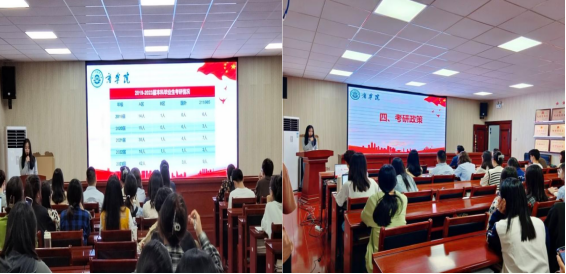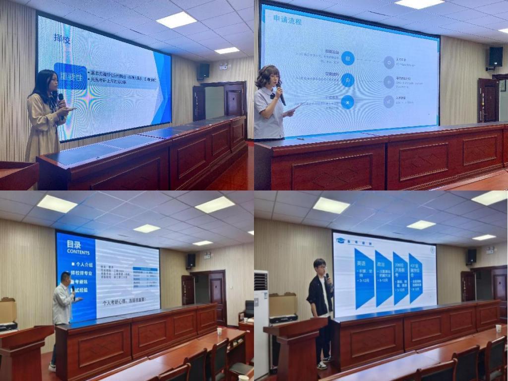 经验分享环节,六位优秀考研学生代表结合自身考研经历,深入细致地分享了备考经验和心得,引导学弟学妹们结合自身情况理性选择报考学校,科学规划考研复习过程,全身心投入考研,坚定信心,持之以恒。同学们积极与学长和学姐们进行沟通,进一步了解相关信息。
