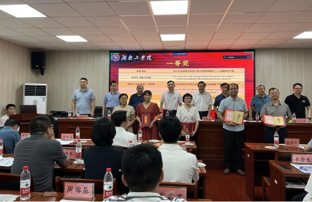 晏华衡宣读“2022年衡阳市经济学会征文”获奖名单。主席台领导为获奖者颁奖,此次共评出优秀组织奖2个,优秀论文20篇。