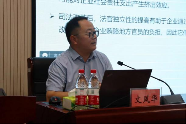 大会第三阶段的学术报告由詹晶主持。中南大学文凤华教授以“法官独立性与CSR”为题作学术报告,他重点从研究背景、研究假设、实证设计、研究结论等几个方面进行详细阐述。研究揭示了司法改革对CSR影响的新证据。通过消除地方政府对司法程序的干预,司法改革提高了法官的独立性,并导致了更高的CSR。