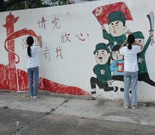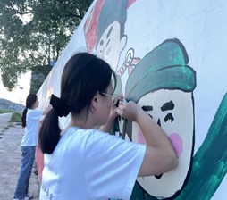 (社会实践团成员对村部墙画进行修缮和维护)