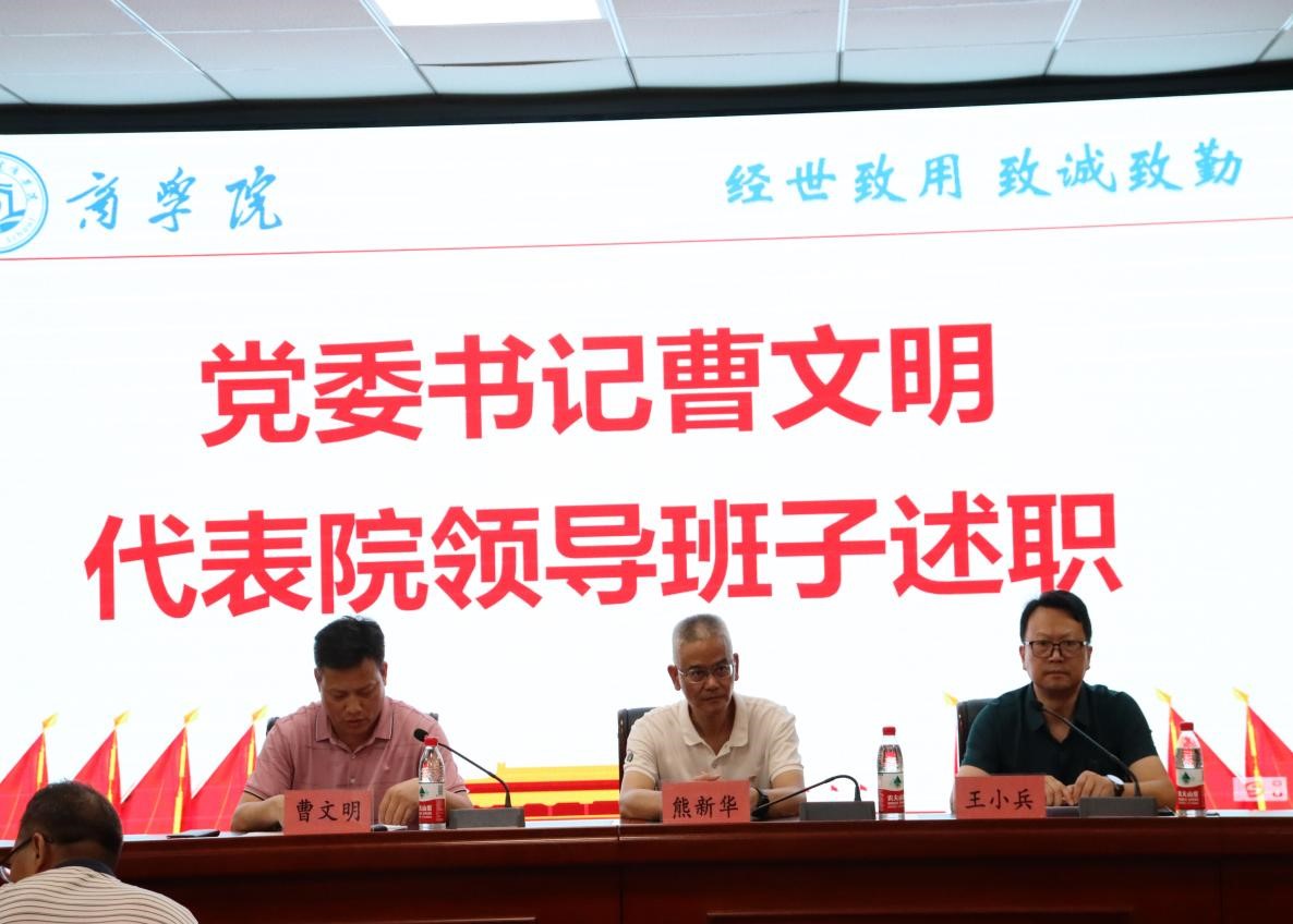 会议第一阶段,党委书记曹文明代表院领导班子述职,围绕基层党建与学生工作、师资队伍建设、教育教学改革、科研创新发展等做了专题汇报,总结回顾了2022年度商学院取得的成绩并明确了今后努力的方向。他表示,2022年在学校党委的正确领导、院领导班子的团结奋进和全院师生的共同努力下,学院在各方面均取得了突出成绩,坚持“数智商院,人文商院”的办学理念和“经世致用,至诚至勤”的院训精神,高质量完成落实立德树人根本任务,将再接再厉,不断进取,组织和带动全体师生为学校改革发展做出更大贡献。