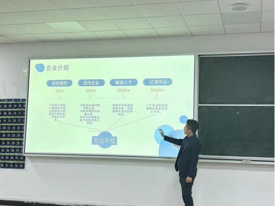 深圳市万企千校网络科技有限公司总经理李松进行了企业宣讲,介绍了公司的企业文化和价值观。他强调了公司对员工的关心和支持,包括提供良好的工作环境、培训机会和晋升通道。他表示:“我们公司鼓励员工的创新和团队合作,为每个人提供展示才华的舞台,让他们在工作中实现个人价值。”
