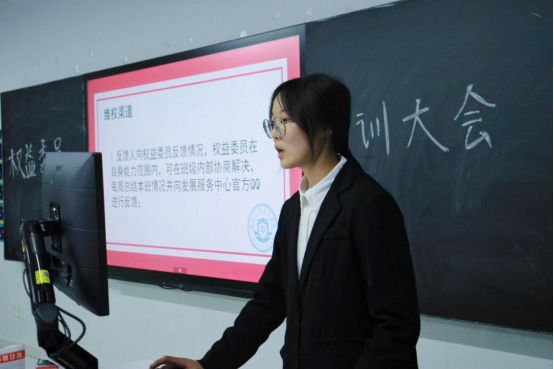 发展服务中心陈思维通过以下四点详细讲解权益委员职责:一是在班级宣传权益知识;二是加强班级与学院的联系;三是每周总结班级情况并反馈至商学院发展中心;四是配合发展服务中心各项活动。并通过介绍三种维权渠道及三方面维权的基本方法,全面维护学生各项权益。