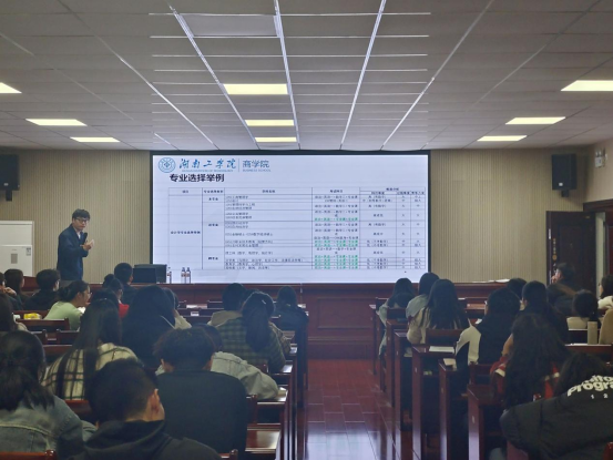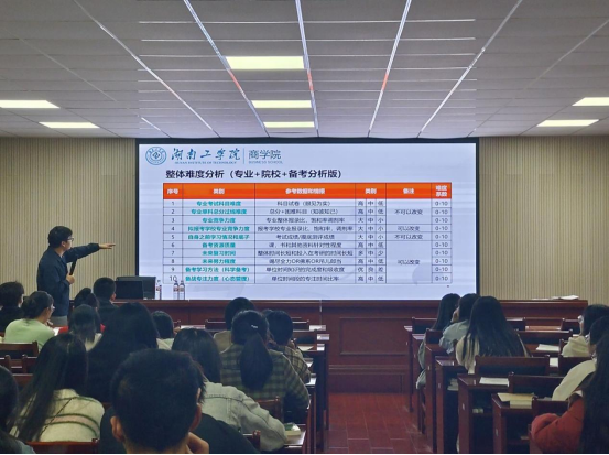 冯浩重点围绕考研目的、择校建议、备考攻略,结合当下考研环境展开辅导讲座,他结合近几年考研规模以及学历、专业、就业竞争力等核心要素之间的因果关系等进行详细分析阐释,并结合中南大学、湖南大学、湖南师范大学、长沙理工大学等高校近几年研究生初试分数线及调剂情况,全面总结了经济管理类专业的考研趋势和院校选择要点,同时也为在场的同学们提出了针对性建议。