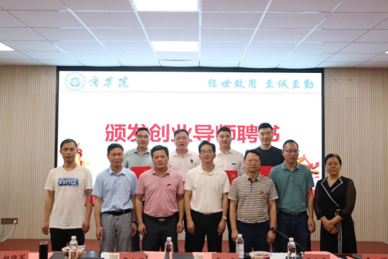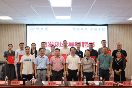全体与会领导为校友们颁发创业导师聘书,深圳陈列共和设计有限公司、湖南良才联合会计师事务所等6家校友企业共同与学院签署就业基地合作协议。