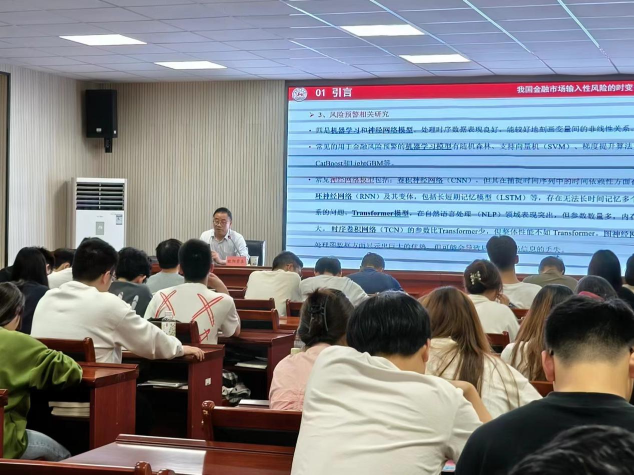 欧阳资生教授以“我国金融市场输入性风险的时变分析与预警研究—基于TVP-VAR-SCInet模型”为题展开学术讲座。他认为,随着金融市场的日益复杂和全球化程度的提高,金融交易数据分析与风险预警成为了金融领域中不可或缺的重要技术。通过对大量金融交易数据的分析和研究,可以帮助金融机构和投资者更好地理解市场环境,并及时发现潜在的风险,从而采取相应的风险管理措施。