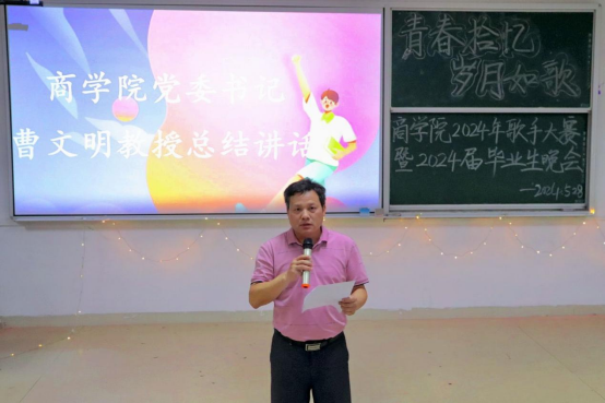 曹文明作总结讲话,首先他对选手和工作人员的努力成果予以充分肯定,他表示“青春拾忆,岁月如歌”歌唱大赛暨2024届毕业生晚会的成功举办,为学生们提供了一个展示自我、实现梦想的舞台,同时他对同学们的未来发展提出以下几点希望:一要把握求知的主动,让终身学习成为良好习惯;二要把握为业的主动,让创新突破成为不竭动力;三要把握人生的主动,让爱国报国成为坚定选择。最后预祝毕业学子们鹏程万里、前程似锦!