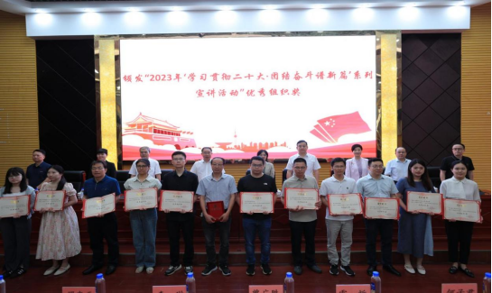 游军华宣读《关于2023年全市“学习贯彻二十大·团结奋斗谱新篇”系列宣讲活动开展情况的通报》,12个单位获优秀组织奖。主席台领导专家为获奖单位颁奖。