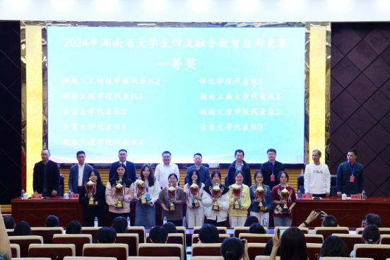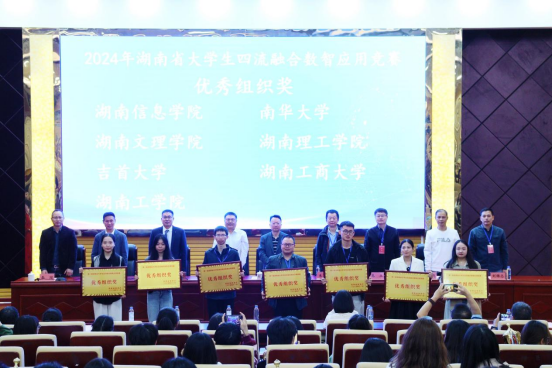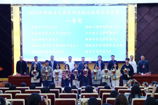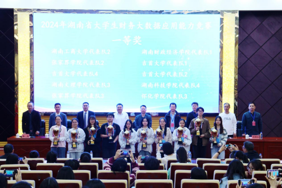 商学院王小兵宣布获奖名单并与主席台领导共同颁奖。其中,大学生财务大数据竞赛中共21支队伍荣获一等奖,28支队伍荣获二等奖,吉首大学、开元集团网站等8所高校荣获优秀组织奖;四流融合数智应用竞赛中19支队伍荣获一等奖,25支队伍荣获二等奖,湖南信息学院、南华大学等7所高校荣获优秀组织奖。