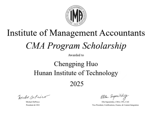 2025年3月,通过层层选拔,我院霍成萍、颜丽阳、张晨依3位同学荣获IMA中国CMA奖学金,CMA奖学金等值金额约6000元人民币。