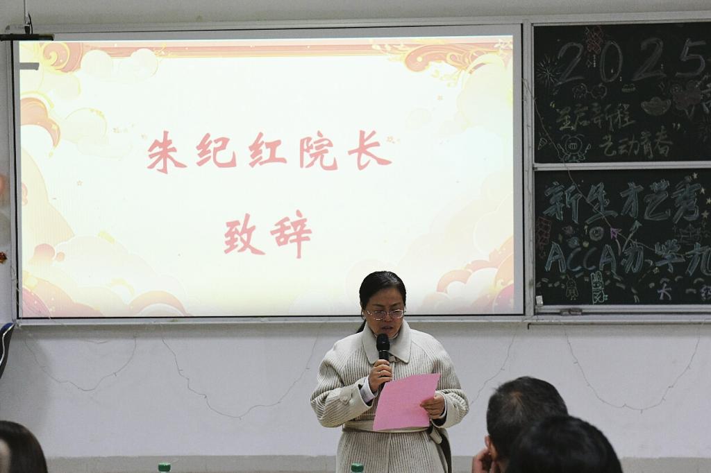 晚会伊始,商学院副院长朱纪红致辞。她回顾了ACCA方向班九年来在人才培养、国际交流与社会影响力方面取得的丰硕成果,表示本次晚会既是对ACCA办学成效的集中展示,也是对2025级新同学的热情欢迎。她勉励全体新生以舞台为起点,在大学阶段不断锤炼专业能力、拓展综合素养,努力成长为具有国际视野与人文情怀的新时代商科人才。