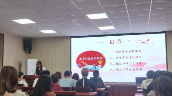 马慧娟老师以“增强诚信,感恩祖国”为题强调了三个方面的内容。一是高度重视,按期还款。讲解了按时还款的重要性,号召贷款毕业生提高诚信还款意识;二是感恩资助,爱党爱国。要树立感恩社会的观念,增强爱国爱党的热情,展示当代大学生的社会责任感和时代使命感;三是不忘初心,牢记使命。要常怀一颗感恩之心,坚守诚实守信之本,不断提升自己综合素质,早日成才回报社会。