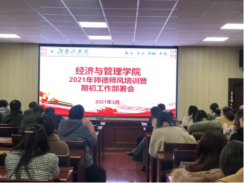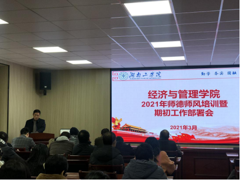 3月5日上午,经济与管理学院在经管楼302报告厅召开了2021年师德师风培训暨期初工作部署会,全院教职员工参加,会议由党委书记张忠贤主持。