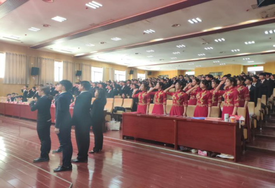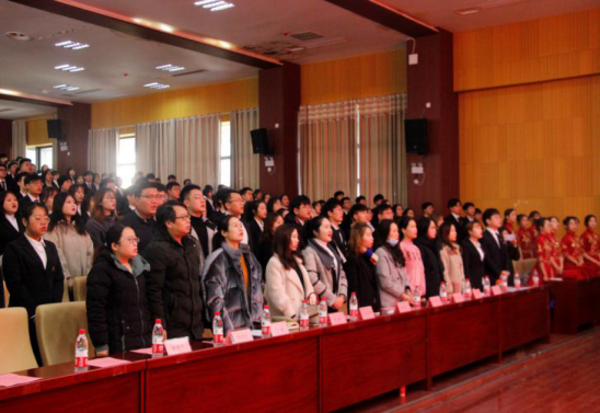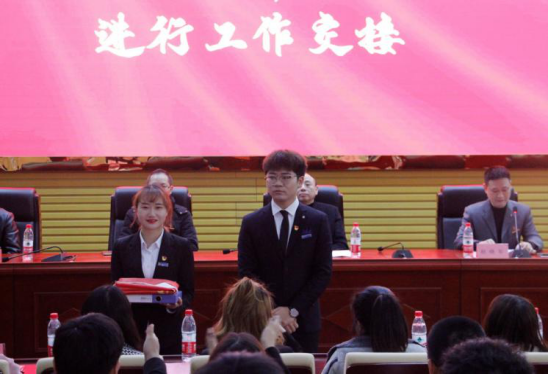 迎院旗后,第十二届学生会执行主席邹虎和第十三届团委常务副书记邓颖进行工作交接。邓颖做了就职演讲,带领新一届团学全体学生干部进行入职宣誓。